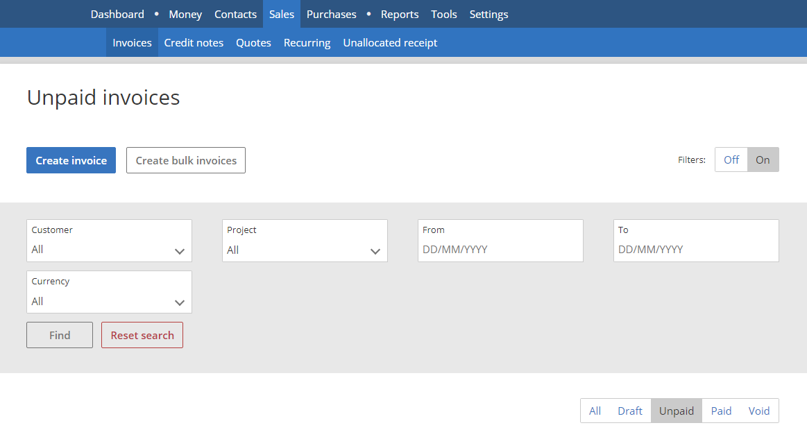Navigate to Sales > Invoices and click on the Unpaid tab.