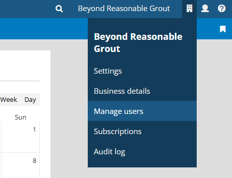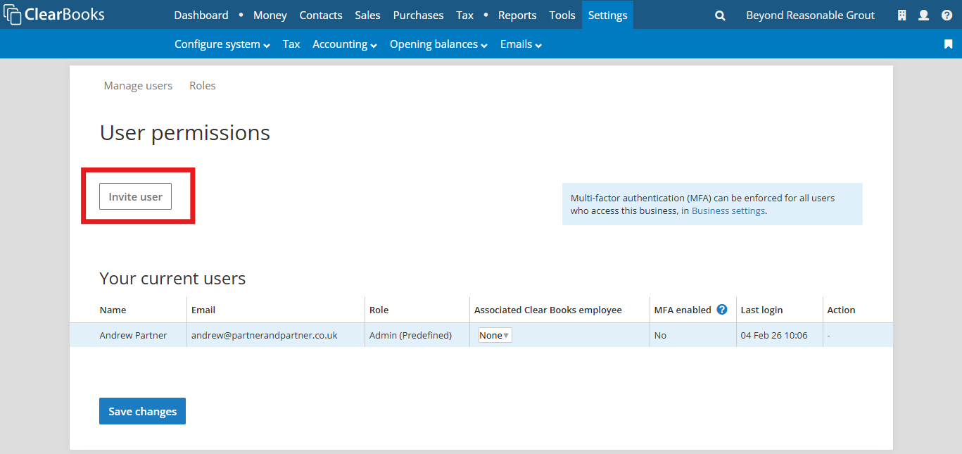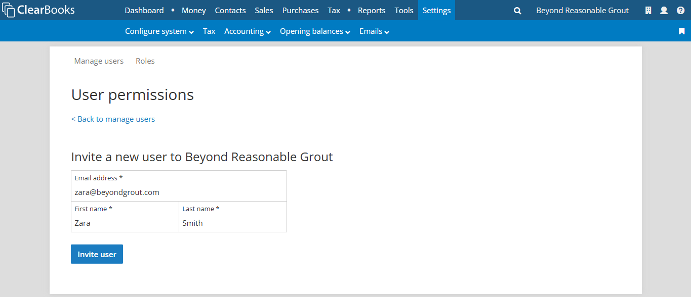 To invite the client user to Clear Books, go to “Manage Users” under the business menu.