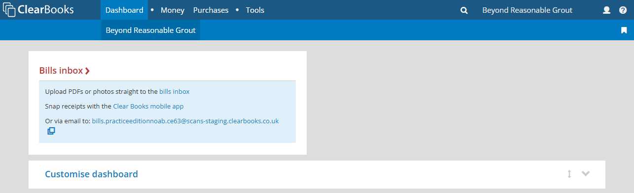 After logging in to Clear Books on a desktop or mobile device browser, the Practice Edition client user will see the bills inbox widget on the dashboard.