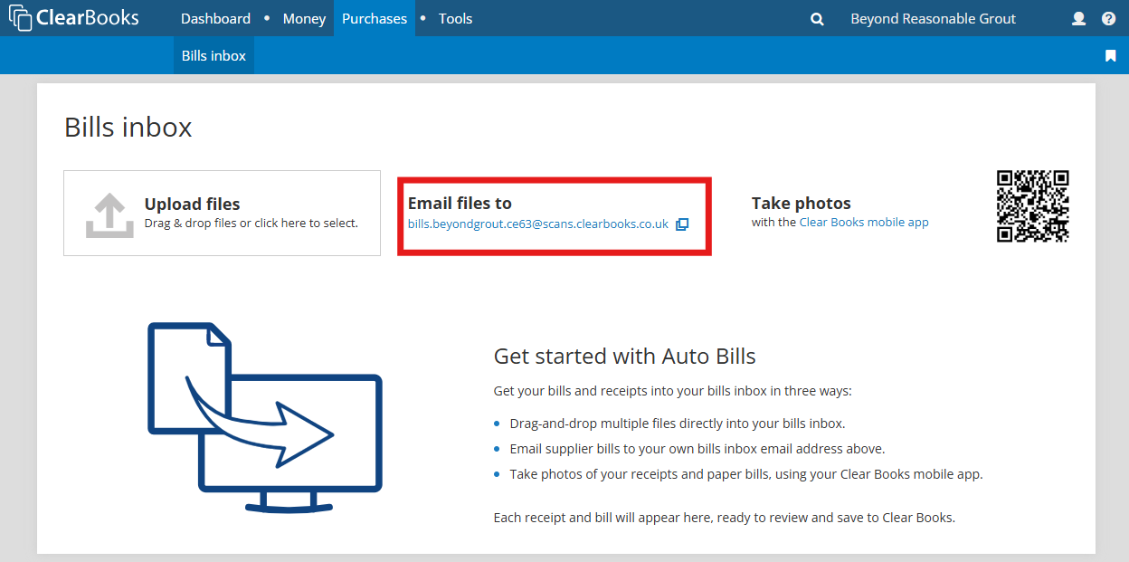 From any email application or browser, the client user can forward or send emails that contain purchase invoices in the email body or as an attachment, to the bills inbox email address for their Clear Books business.
