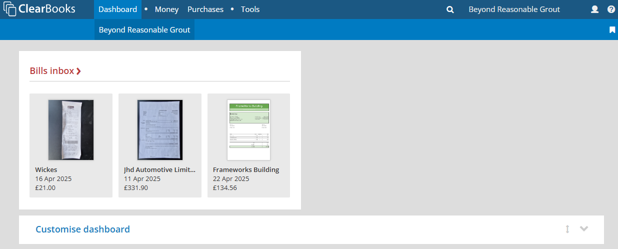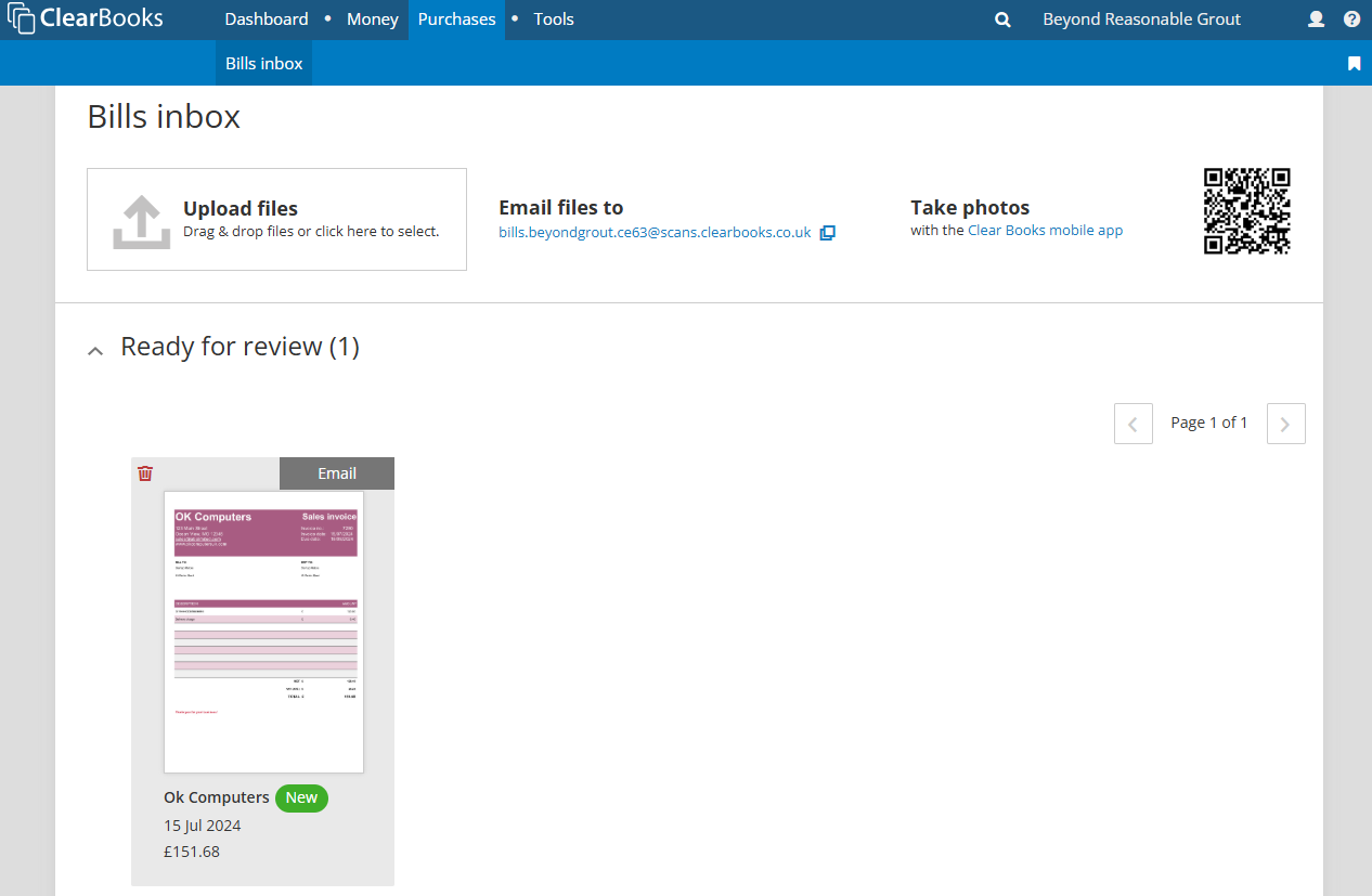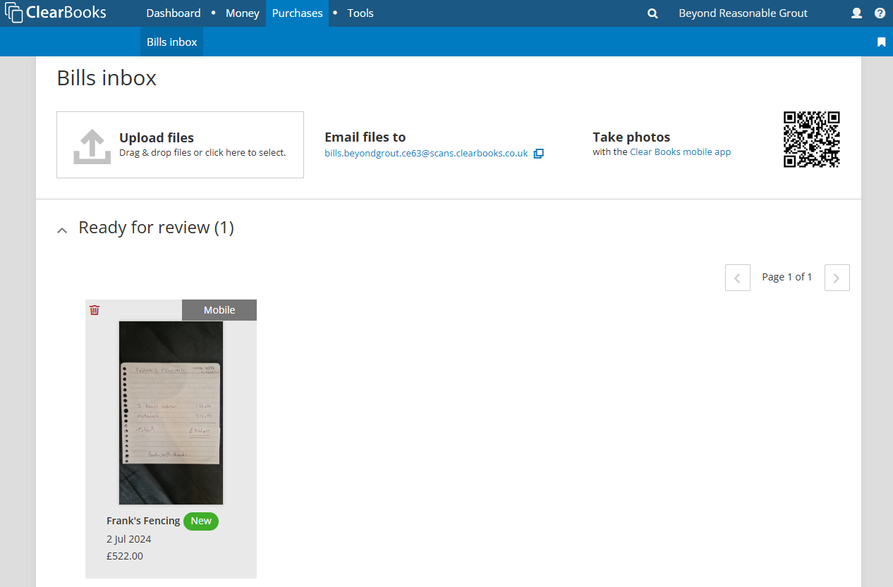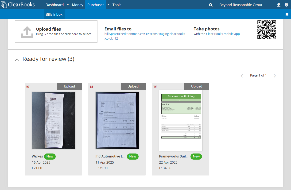 After the photo has been received by Clear Books, it will appear in the bills inbox ready to be reviewed and saved by the practice user.