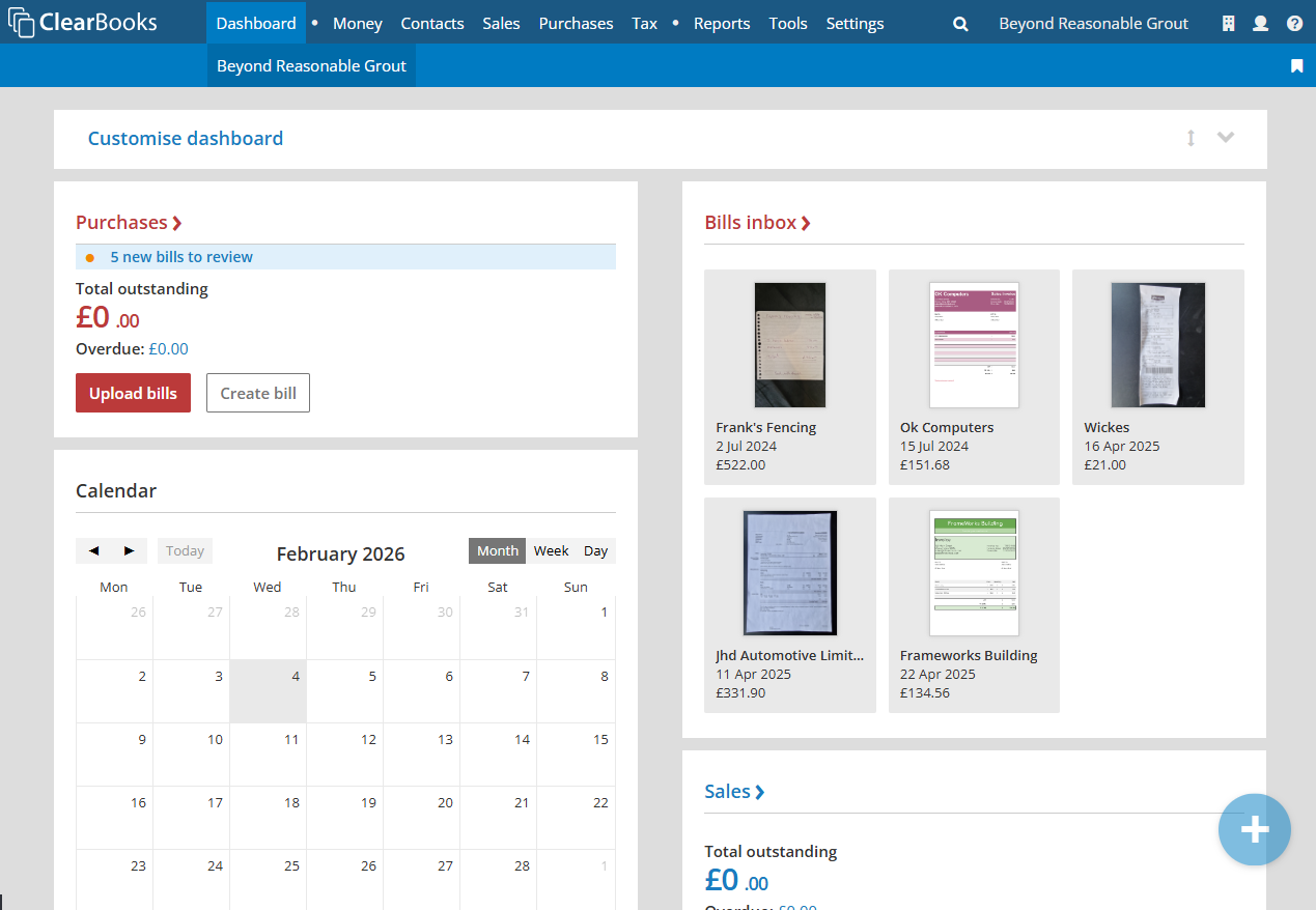 The practice user can see any new files sent to the bills inbox by the client when they view the business dashboard in Clear Books.