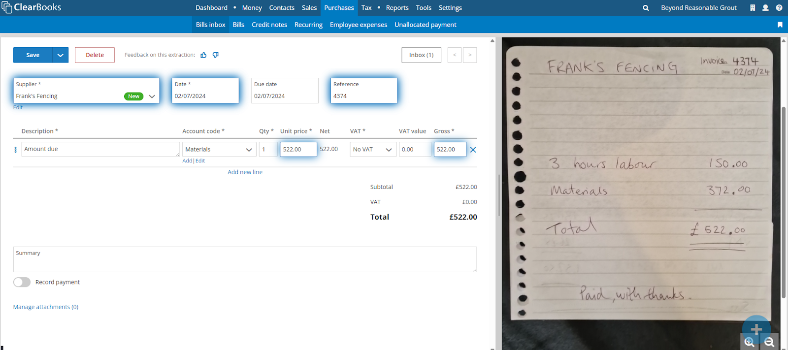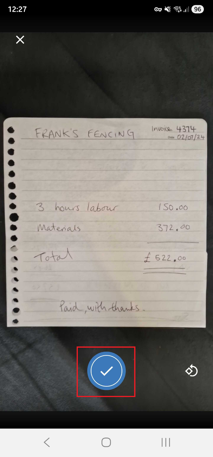 Take photos of tills receipts, printed and even hand written invoices.